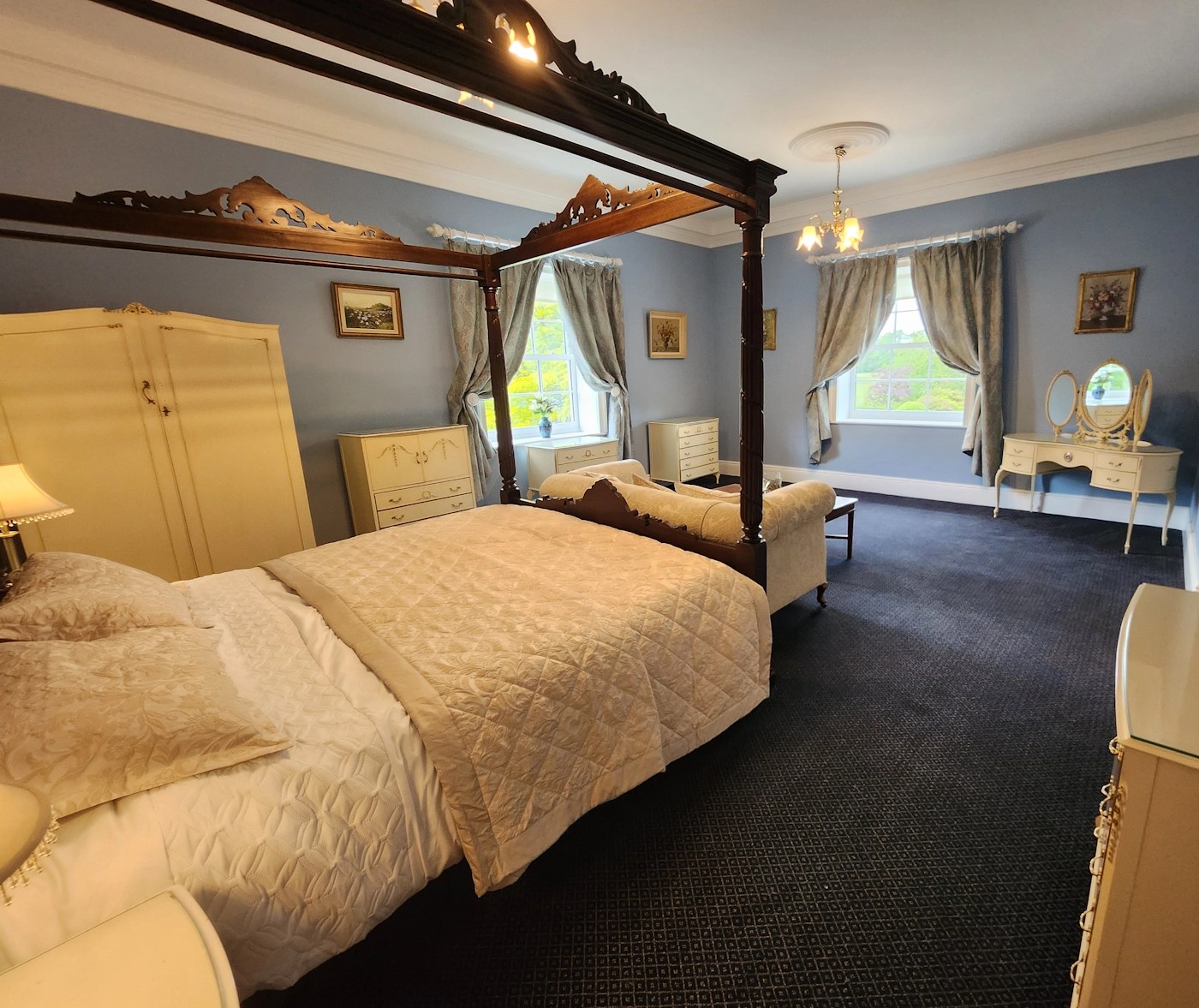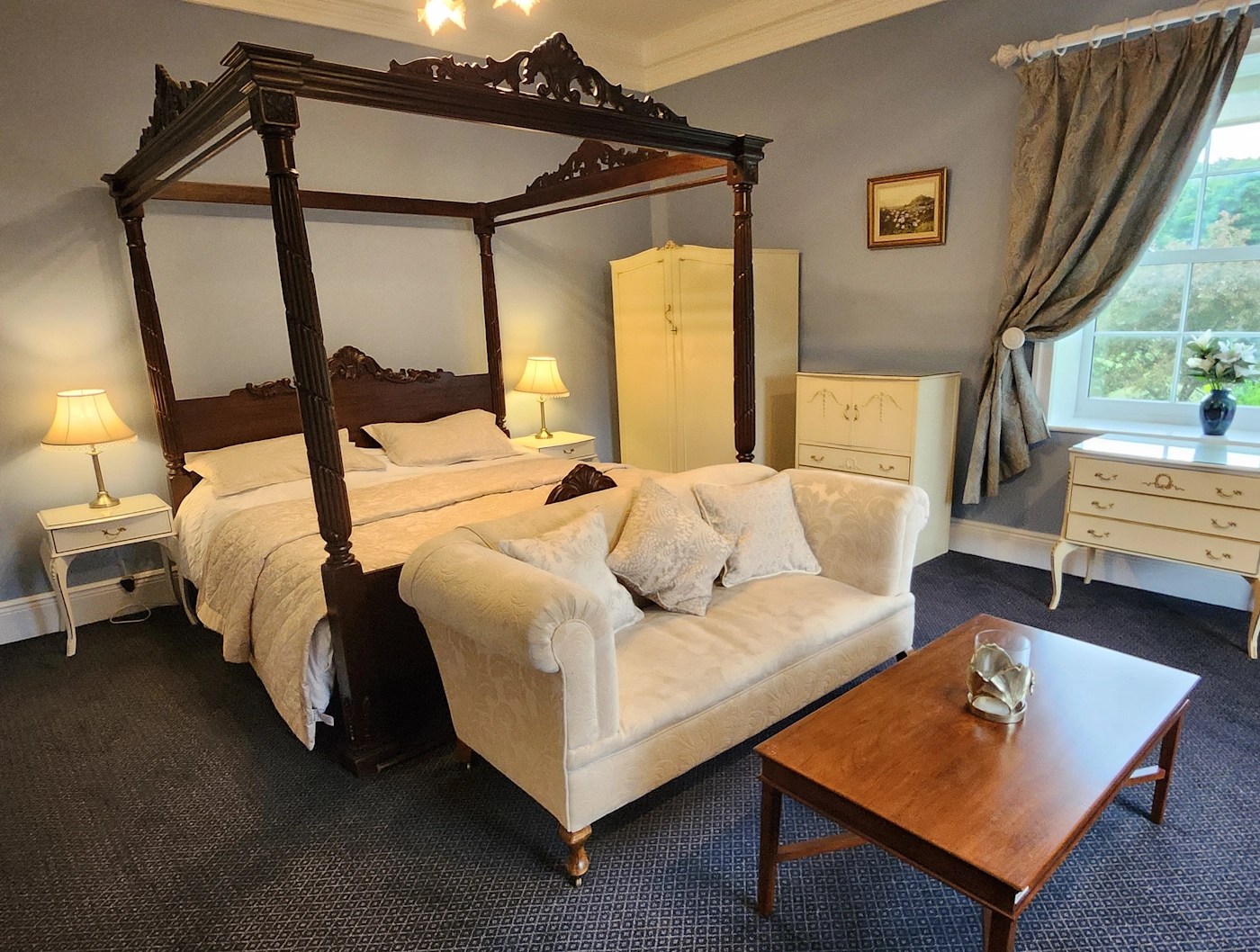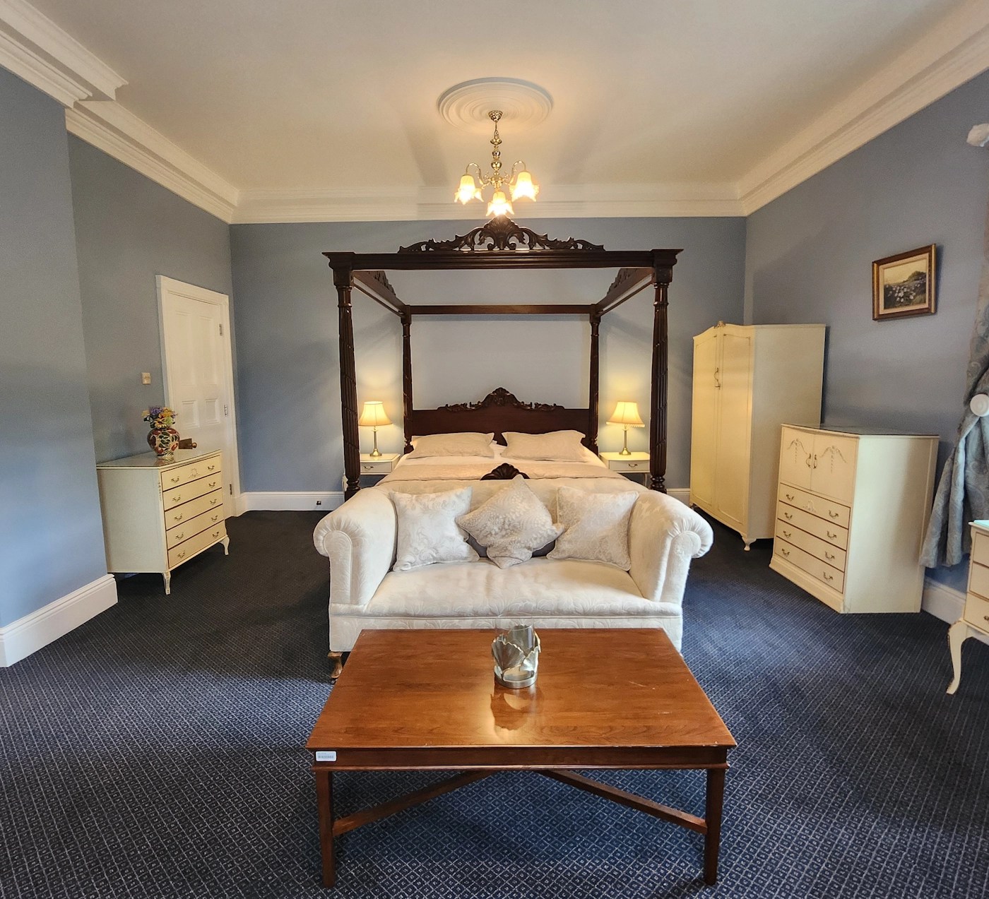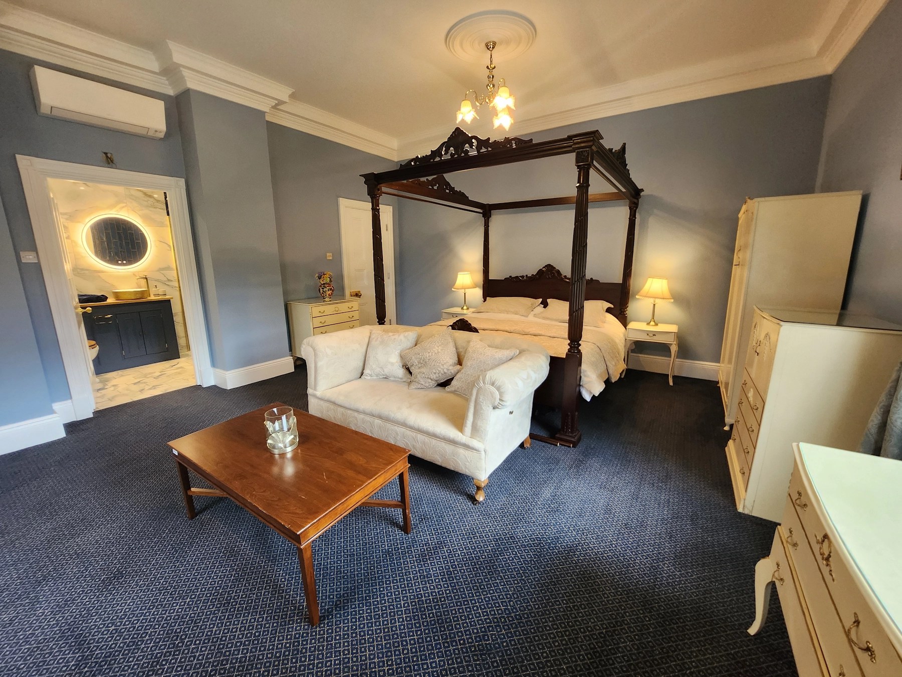 Welcome to The Regency, where your stunning four poster bed meets vintage furniture, beautiful views and a gorgeous dark blue themed marble bathroom.