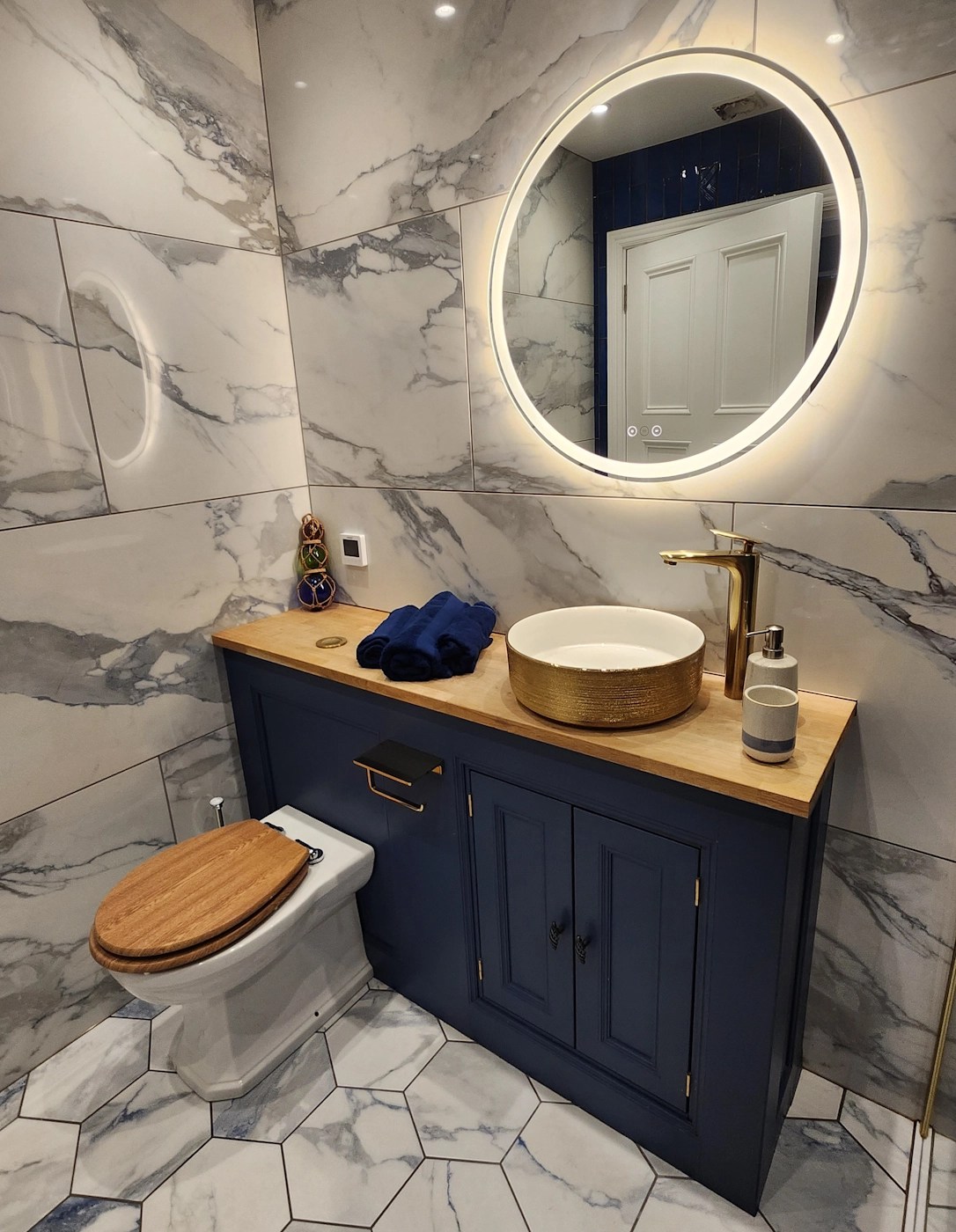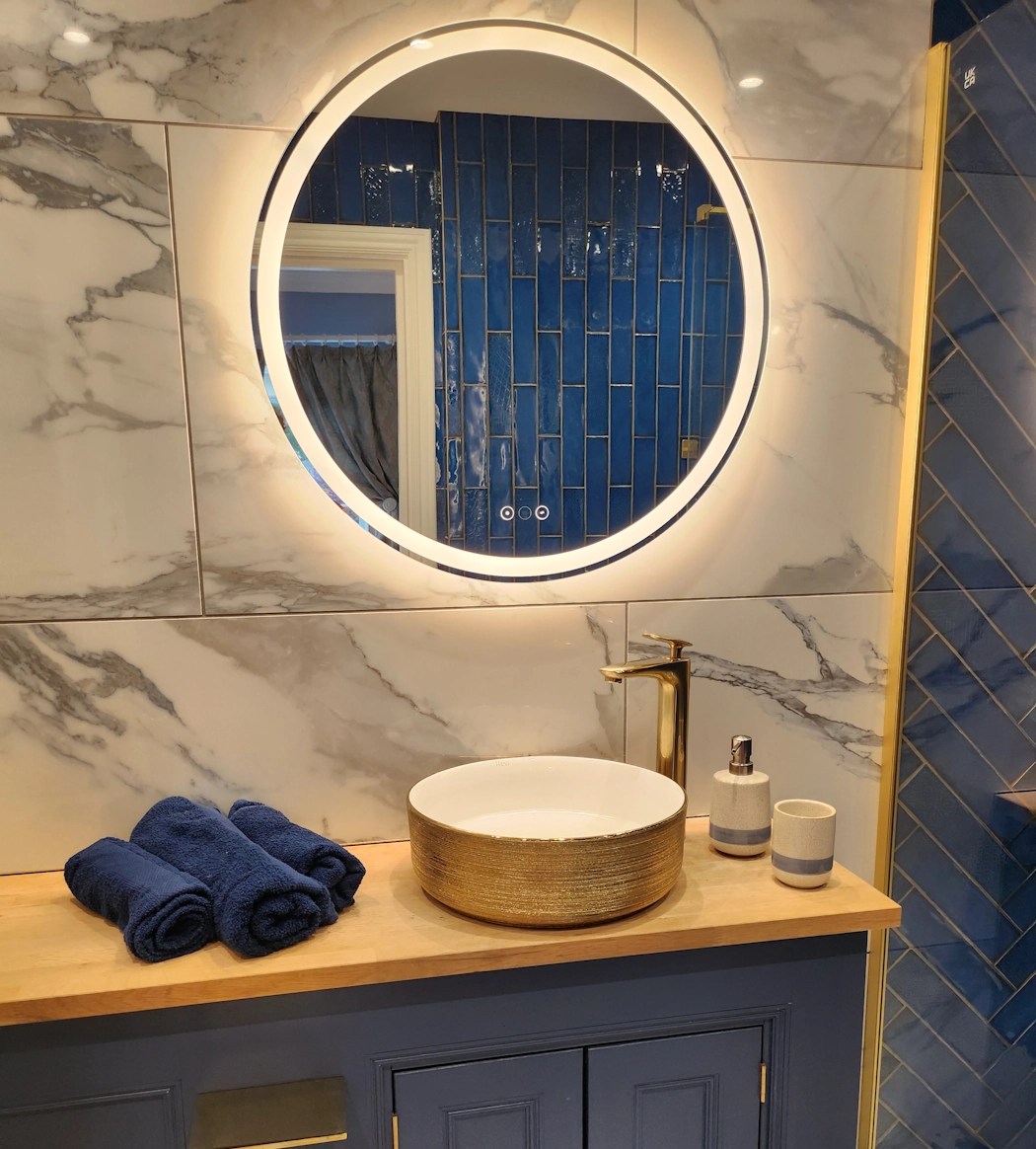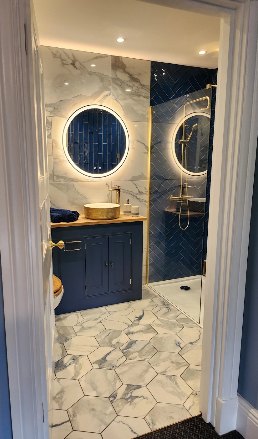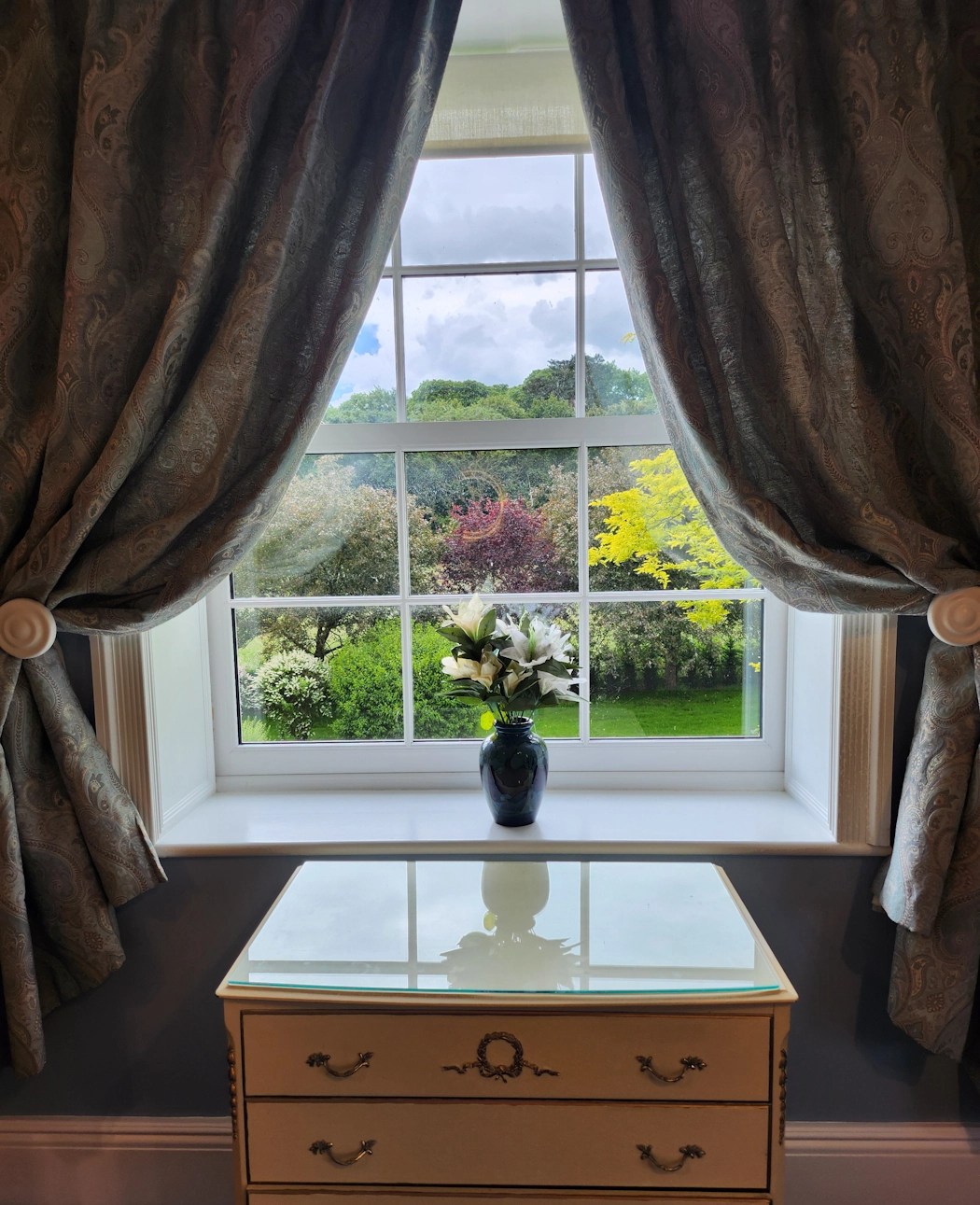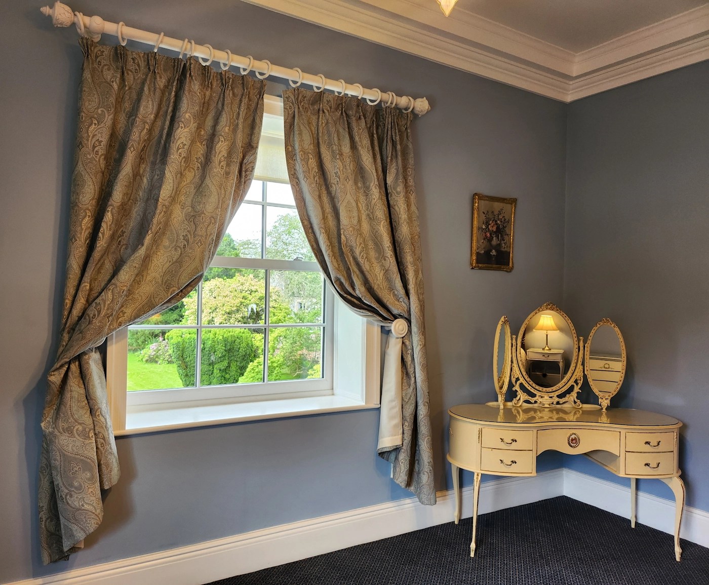 Welcome to The Regency, where your stunning four poster bed meets vintage furniture, beautiful views and a gorgeous dark blue themed marble bathroom.